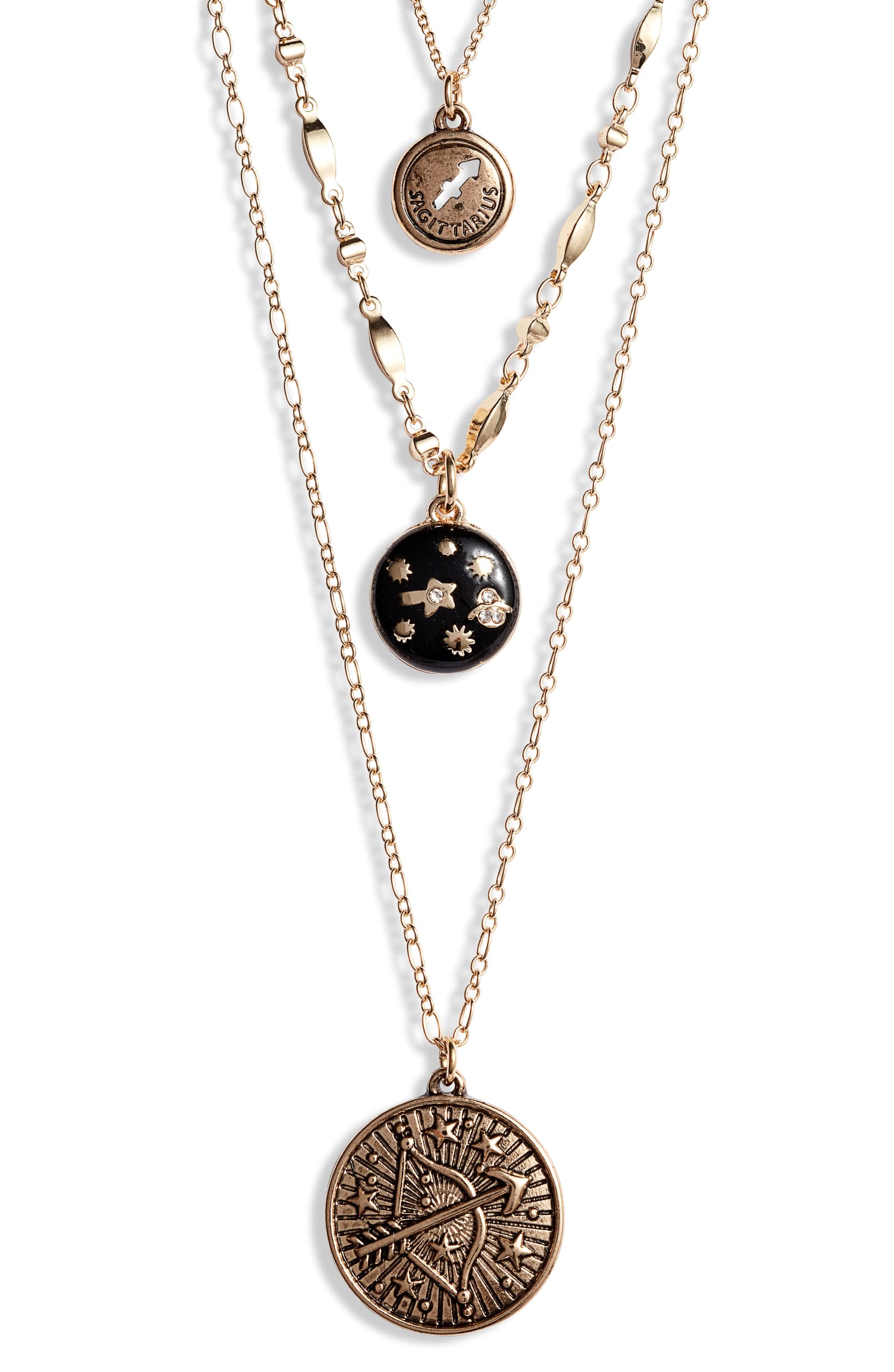 Triple layered gold necklaces with assorted Sagittarius-themed charms.