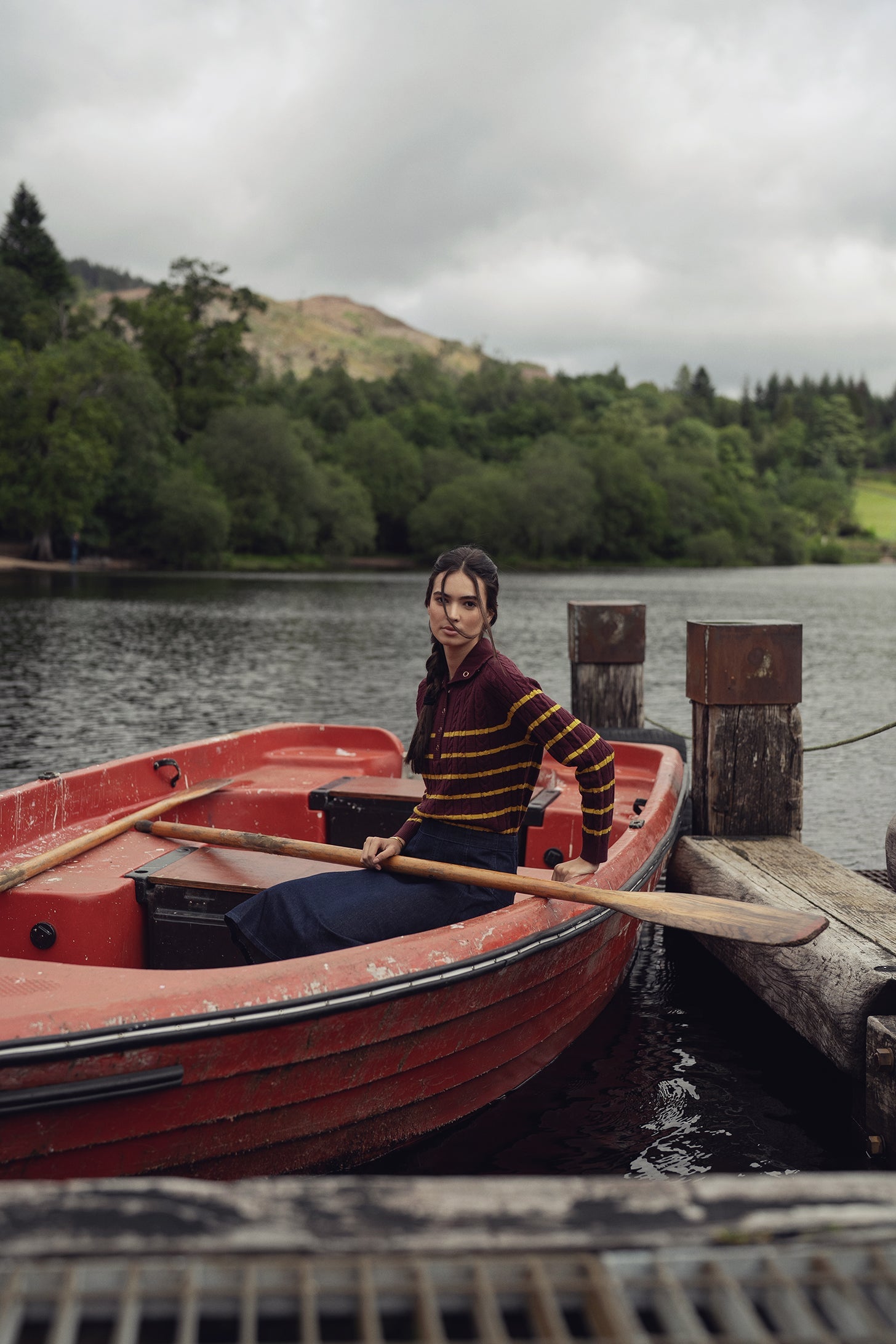 This Shawl Snap Collar Striped Cable Sweater in burgundy and yellow combines classic cable knit craftsmanship with a contemporary striped design. The rich color contrast enhances its timeless appeal, making it an ideal layering piece for transitional weather or sophisticated casual wear. Durable and finely knit, this sweater balances comfort and structure for a timeless look.